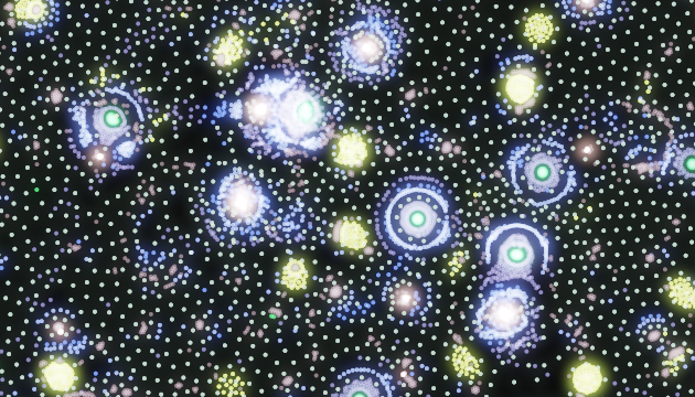 An in-browser particle simulation based on some fake physics laws that lead to "life-like" behavior. I've written a comprehensive blog post on how exactly it works. |
